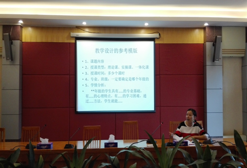 冯艳丹主任就说课的具体注意事项、教学设计等进行了详细解说,并深入讲解了教学目标分析、学情分析、教法分析、教学过程、教学反思与评价等方面的内容。冯艳丹主任强调,比赛时要结合所教专业特点,把岗位职业素养融入到教学设计与说课当中去。希望参赛教师发散思维,全力以赴,认真积极备战。