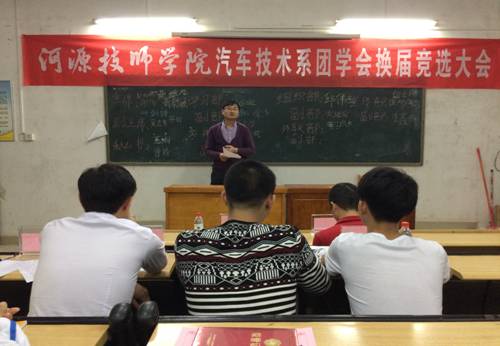 2016-04-11汽车技术系召开团学干部换届竞选大会 为保障汽车技术系团总支学生会工作的连续性,大力促进系部新一届团学干部队伍建设,汽车技术系于2016年3月31日晚在8104召开新一届的团总支学生会换届竞选大会。汽车技术系主任石功名、副主任张洪军、团总支书记艾文军、黄小丹老师和全体...