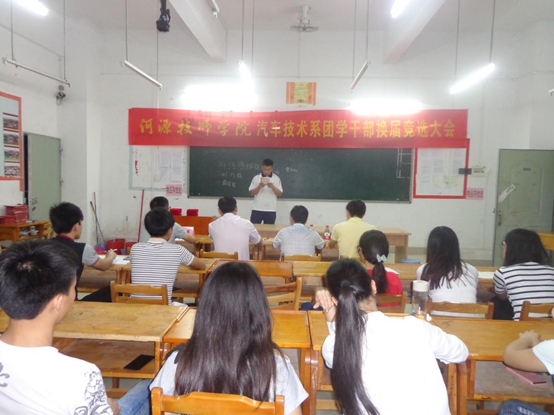 为保障汽车技术系团总支学生会工作的连续性,大力促进系部新一届团学干部队伍建设,汽车技术系于2015年5月25日晚在8号楼202教室召开新一届的团总支学生会换届竞选大会。汽车技术系主任石功名、副主任谢平、副主任张洪军、团总支书记艾文军和全体13届团学干部出席了竞选大会。