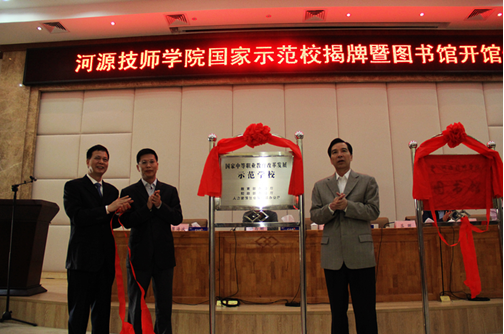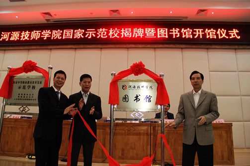 常务副市长彭定邦同志、市人社局局长苏晖同志和黎海波院长一起为国家示范校和图书馆新馆揭牌。