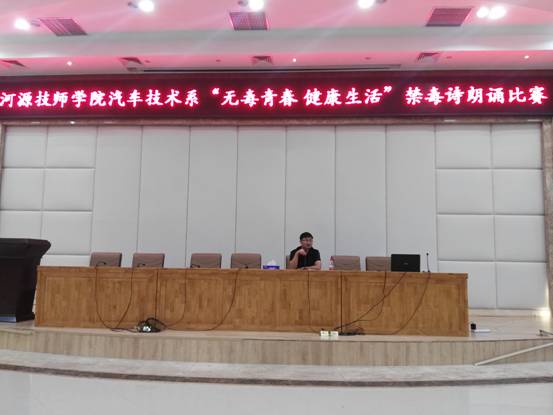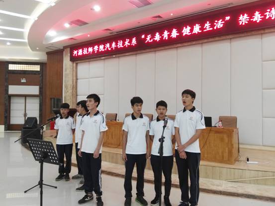 为进一步加强我校禁毒教育工作,提高广大师生对毒品犯意识,推动创建“平安校园”活动,汽车技术系与2017年6月21日在图书馆报告厅举办了“无毒青春 健康生活”诗朗诵比赛,汽车技术系主任石功名、团总支书记郑文富及全体师生参加此次活动。