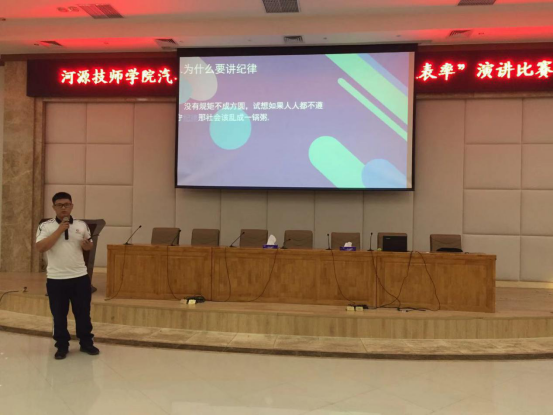 比赛过程精彩激烈、高潮迭起。参赛选手图文并茂地演讲了身边或社会中违纪违规的现象,深刻地分析了违纪违规的严重后果,强调了遵规守纪的重要性,并号召同学们要做一名合格的中职生。