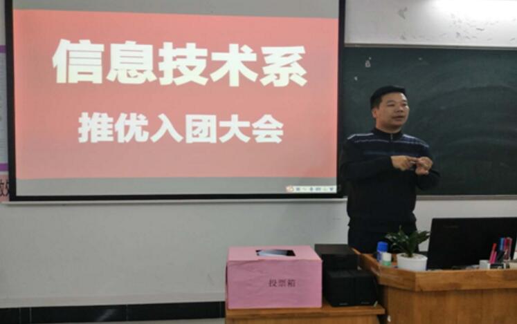 2017-11-02信息技术系举行“推优入团”大会为了不断壮大团员队伍建设,信息技术系团总支于2017年11月1日晚在B302教室召开了“推优入团”大会。信息技术系朱少威主任、巫骑伟副主任、黄丽娥副主任出席会议,团学会理事成员、部分团员代表以及入团积极分子候选人参加了“推优入团”大会。(图一...