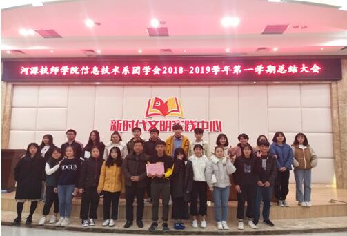 信息技术系团学会2018-2019学年第一学期总结大会 2019年1月2日晚,信息技术系团学会在图书馆报告厅召开了2018-2019学年第一学期总结大会。巫骑伟副主任出席,信息技术系团学会全体成员参加会议。 (图一)会议现场 (图二)团学会主席张晓哲同学总结 (图...