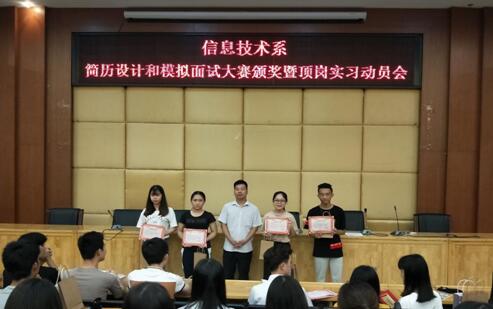 2018-06-15信息技术系简历设计和模拟面试大赛颁奖暨顶岗实习动员会为做好即将参加顶岗实习学生的动员和各项前期准备工作,引导学生顺利走向工作岗位,信息技术系于2018年6月12日晚在培训楼讲学厅举办了“简历设计和模拟面试大赛颁奖暨顶岗实习动员会”。信息技术系巫骑伟副主任出席,2016级全...