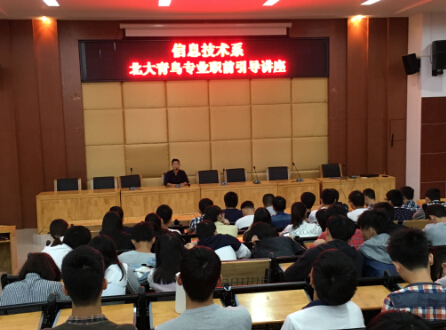 为了帮助即将步入社会生活的2015级学生认知自我价值,自身专业,就职困难等问题,2016年10月12日上午,sunbet申搏信息技术系在实训楼讲学厅举办以“北大青鸟专业职前引导讲座”为主题的北大青鸟专业讲座。讲座邀请了广东服务中心学术专员赵老师,担任主讲,信息技术系2015级北大青鸟专业全体学生聆听了本次讲座。