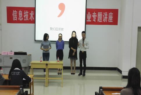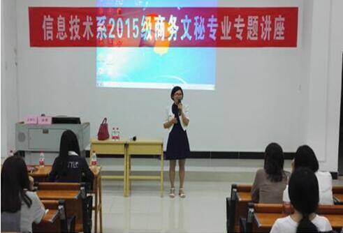 为进一步提升商务文秘专业学生专业技能和综合素质,拓宽学生的就业路,为学生的毕业设计汇报提供实践参考,2017年4月26日晚,sunbet申搏信息技术系在培训楼阶梯教室厅开展“信息技术系2015级商务文秘专业专题讲座”。讲座邀请了河源著名主持人、艾语团婚礼主持团队创始人——帅率,原信息技术系07届电子商务班优秀毕业生帅国亮,及他的团队为信息技术系15级商务文秘专业学生带来了一场精彩讲座。