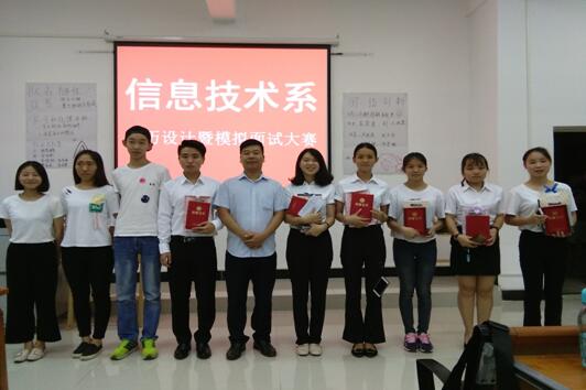 为增进学生对求职面试的了解,提高学生对简历的认识和设计水平,掌握面试的技巧与礼仪,2017年6月13日晚,信息技术系在E栋三楼阶梯教室举办了2015级学生模拟面试大赛,信息技术系巫骑伟副主任出席并担任评委,信息技术系2015级学生观看了比赛。