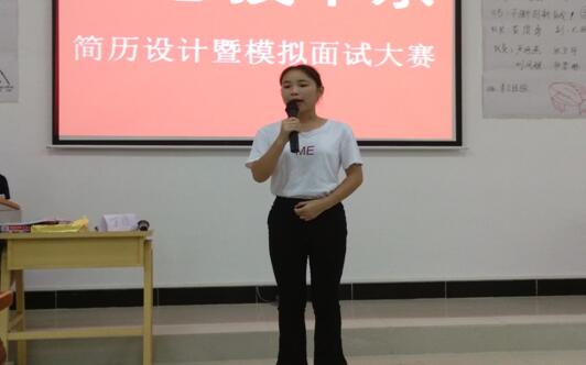 本次大赛分为三个环节:PPT展示个人风采、多对一面试和自我总结。选手们一边用PPT展示自己制作的个人简历,一边进行自我介绍,包括专业知识、教育经历、社会实践等内容。接下来,选手们进行“多对一面试”环节,选手们充分展现了思考和反应的灵活度。最后,选手们用简单的几句话进行了总结,表达了自己对求职岗位的意愿。经过激烈的角逐,最终由2015级文秘专业的廖国丽同学获得第一名。