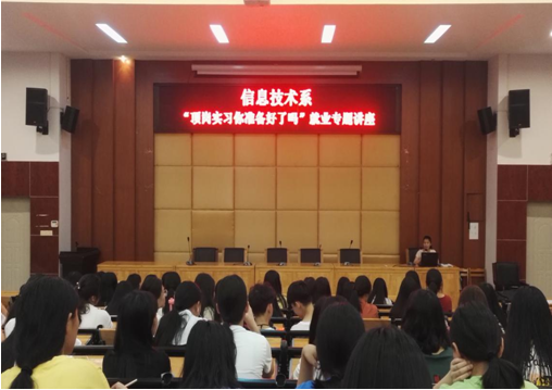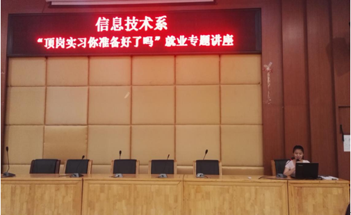 为了引导即将顶岗实习的学生做好工作的心理准备。5月15日晚,信息技术系在培训楼讲学厅举办了“顶岗实习你准备好了吗”就业专题讲座。讲座邀请了sunbet申搏信息技术系2015届商务文秘专业优秀毕业生梁小芳为主讲嘉宾,文秘专业教研组长巫艳芬老师出席,文秘专业全体学生聆听了讲座。