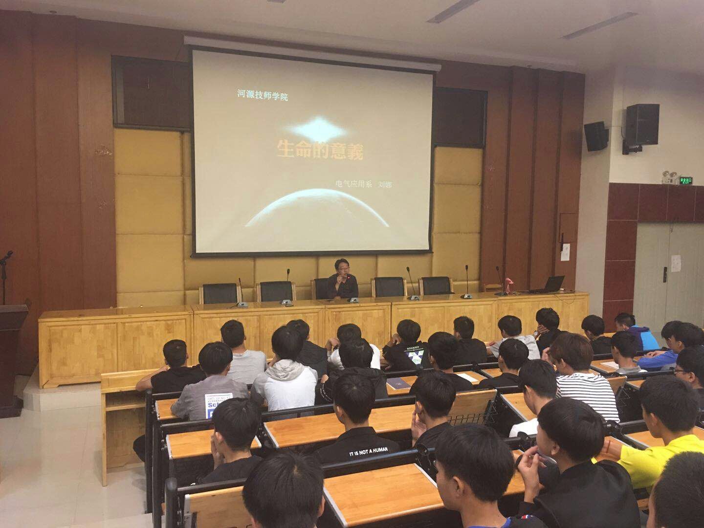 2017-11-08生命的意义为了提高学生对生命的认识,深刻了解和体验生命的价值,充分发挥个人的特长,2017年10月26日晚,电气应用系在培训楼讲学厅举行了“生命的意义”主题讲座。讲座由电气应用系副主任谷瑞光主持,刘娜老师主讲,2017级全体班主任以及全体新生参加了讲座。(图一)讲座现场电...