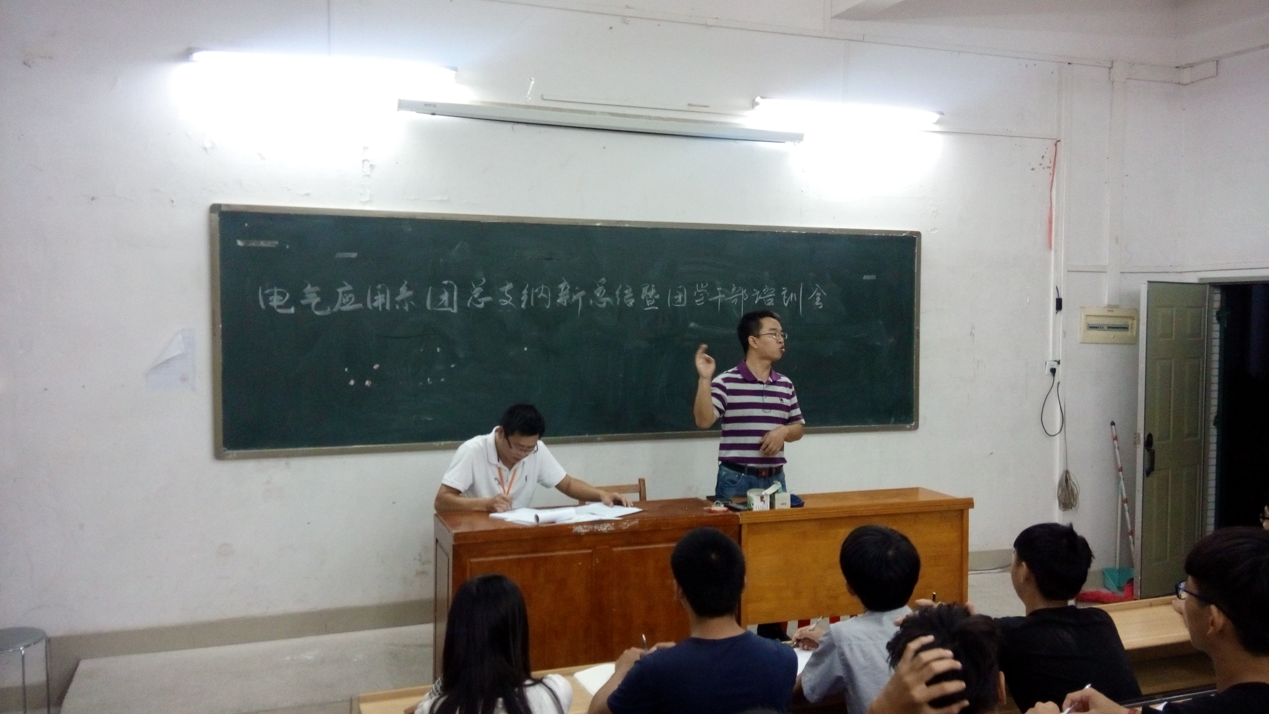2015-11-01电气应用系举行团总支纳新总结暨团学干部培训会议 2015年10月26日晚上电气应用系团总支在8104教室举行纳新总结及团学干部培训会议,出席会议的有张雪峰主任,王文胜老师及全体团学组织成员。 会议总结了前期纳新工作,2015...