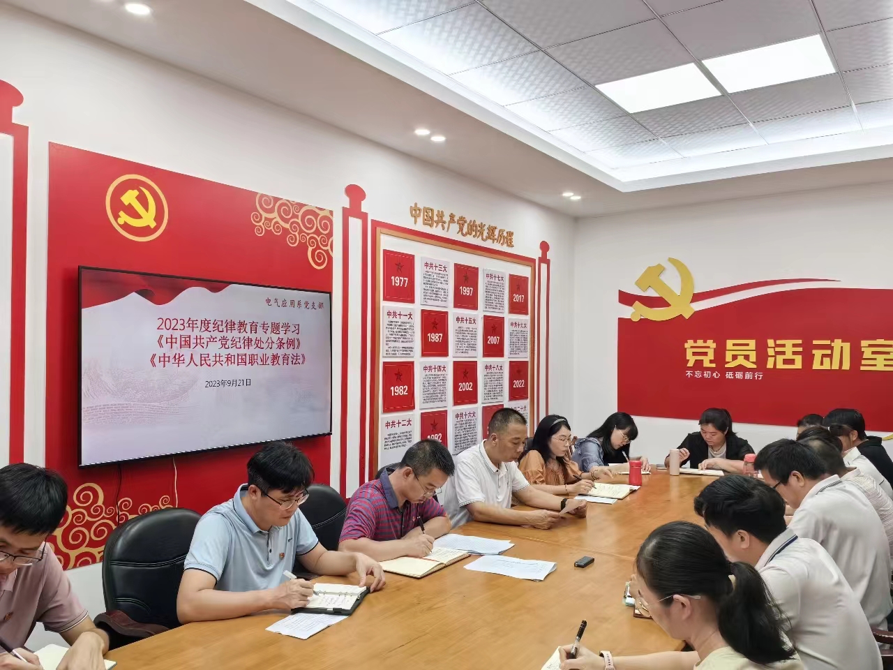 2023-10-10电气应用系党支部召开“2023年纪律教育月专题学习”会议2023年9月21日下午,在一号楼党员活动室召开“2023年纪律教育月专题学习”会议,会议议程有四项:第一议题集中学习,支部意识形态、网络安全研判会,支部党风廉政研判会,纪律教育月专题组织生活会。会议由党支部纪检委员吕秋...