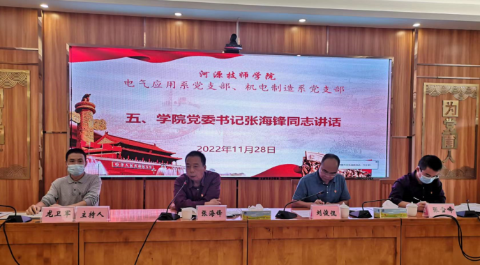 2022-12-01凝心聚力抓党建联学共建促发展——电气应用系党支部和机电制造系党支部联学共建党员大会2022年11月28日下午,电气应用系党支部与机电制造系党支部在一号楼大会议室召开联学共建支部大会。学院党委书记、院长张海锋同志,学院党委委员、副院长刘俊侃同志出席了会议,会议由机电制造...