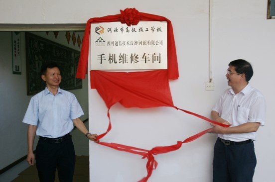 6月24日,我校与西可通信技术设备(河源)有限公司(下称“西可公司”)校企合作签约仪式在我校体育馆隆重举行。欧阳仕文校长与西可公司总经理何荣特先生为“人才培养基地”揭牌。“西可公司手机维修车间”进驻我校,标志着河源市首个“校中厂”正式建立。