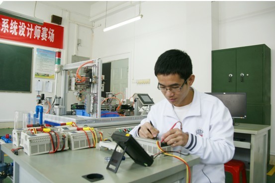 今年11月份,学校5号楼204可编程序控制器实训室部分设备频发故障,影响日常教学。原厂技术人员对设备进行仔细检查之后表示设备损坏严重无法修理,需重新购置设备,预计花费四万元。本着给学生提供一次真刀真枪锻炼机会的目的,可编程序控制专业老师张雪峰安排李碧安同学进入实训室尝试修理。接到任务后,李碧安同学马上对设备进行细致的检修。没有材料,他就上网购买维修原材料;没有焊接IC专用的工具风枪,他就用普通的电焊烙铁代替,经过两天废寝忘食的努力,最后,他不负众望,终于攻破技术难关,11台原本报废的机器重新运转起来!