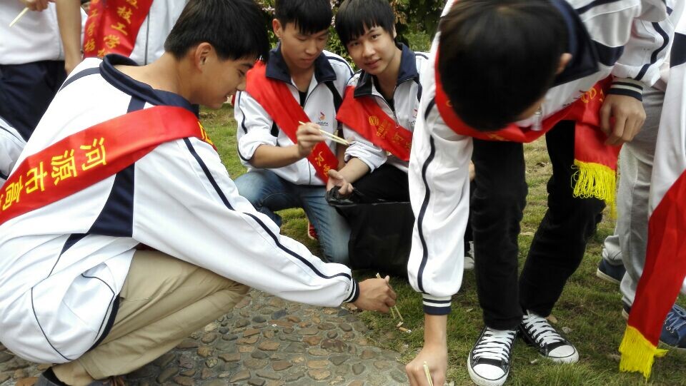 我们开始前往后山,从饭堂后面上去,有一条一米多宽的石头小径,小径不长,两旁种了许多树,桠枝上开满了漂亮的花朵,我们都非常兴奋。刚开始,并没有看见多少垃圾,只有少许的烟头,我们拿着一次性筷子和塑料袋,一边走一边夹,没几分钟,垃圾多了起来,大家开始认真的工作。很快,除了枯草和枯落的树叶,垃圾都被我们清理干净了,整个后山空地干净了起来,干净美丽的草坪包含着我们辛勤劳作的成果,我们都很欣慰。