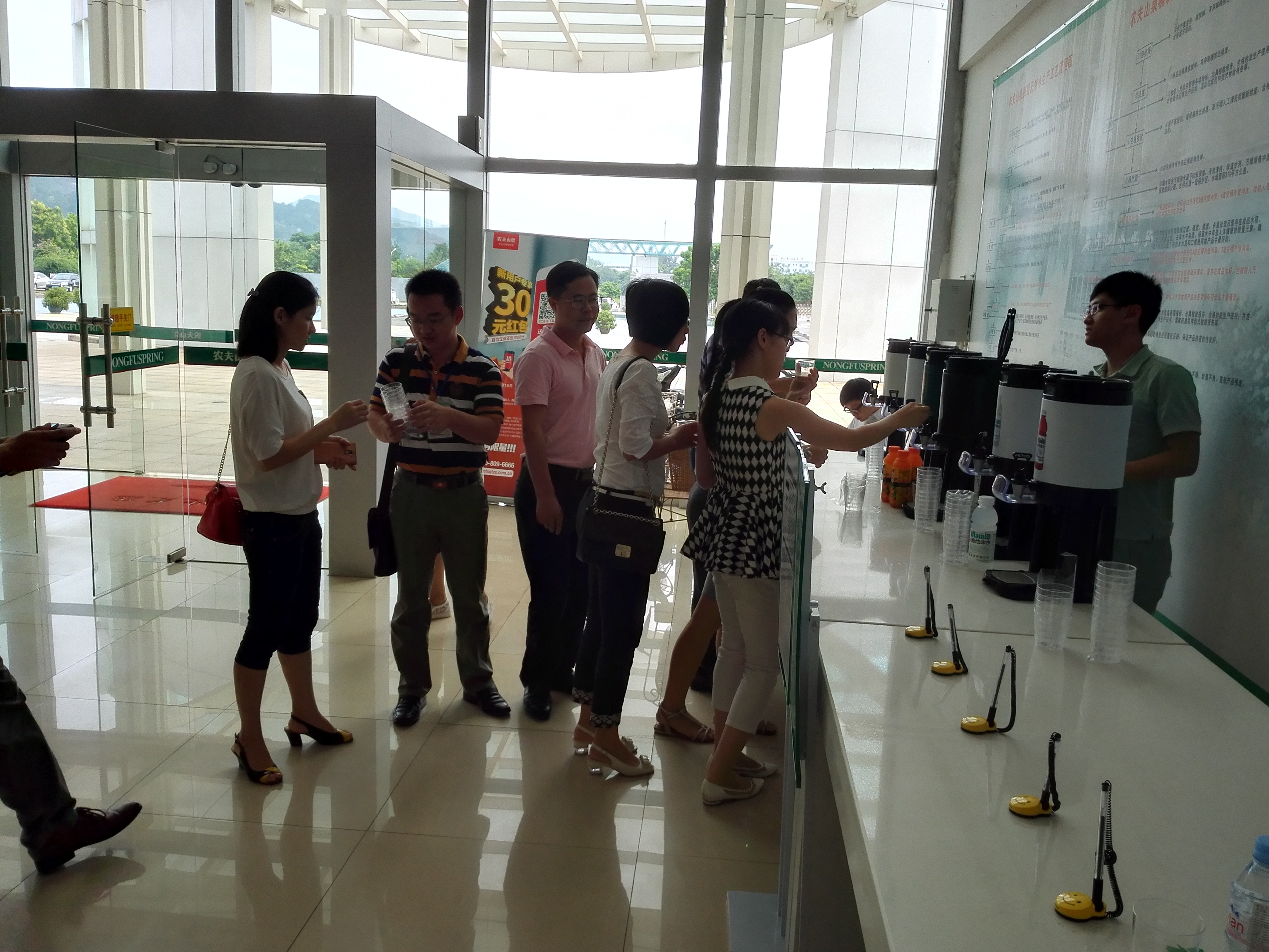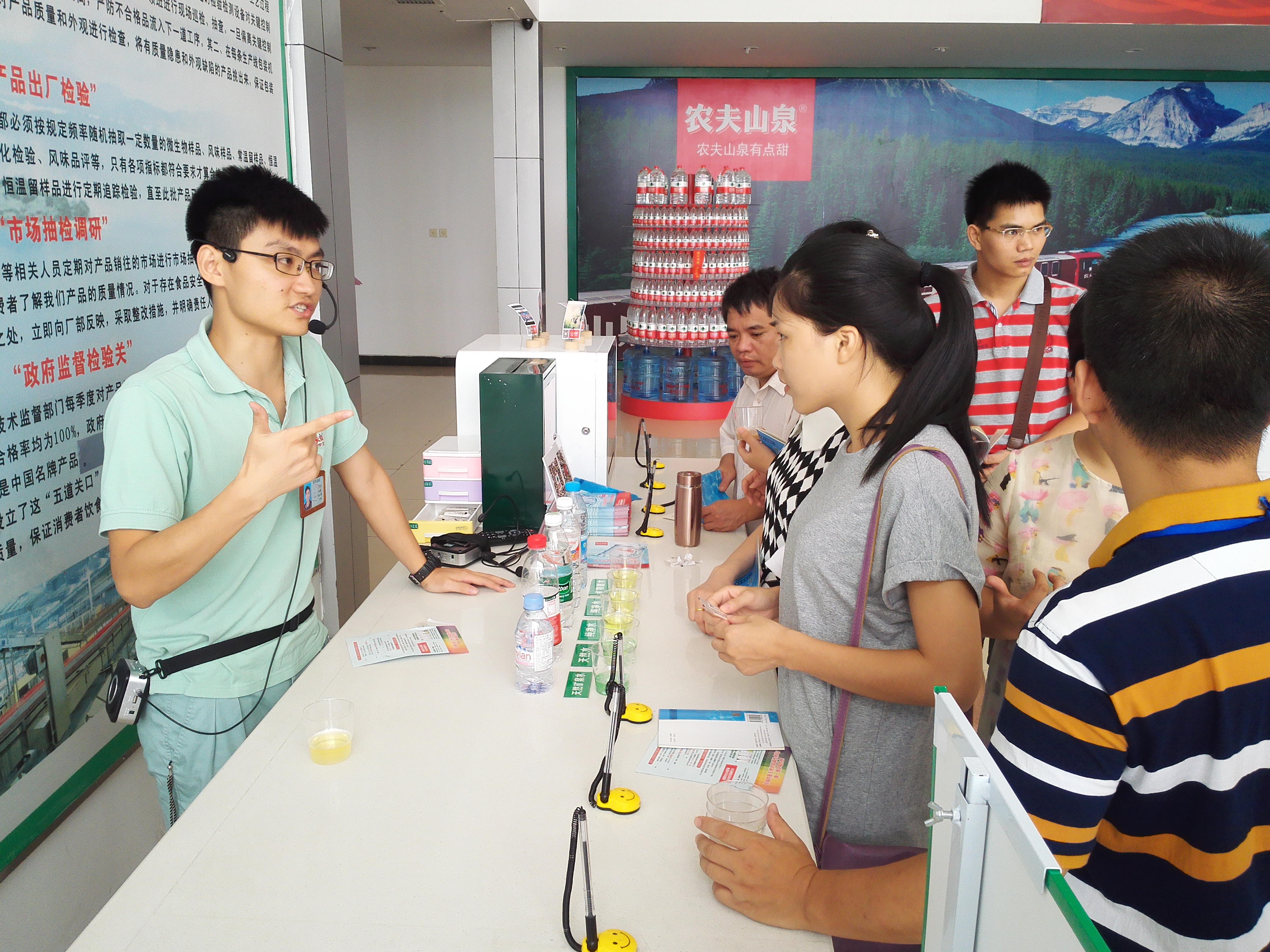 来到农夫山泉广东万绿湖有限公司里,先在人事科的李先生介绍下,了解农夫山泉旗下的所有产品,并对其产品进行品尝。接着李先生就市面上矿物质水、蒸馏水、纯净水和天然水进行简单的PH试验,试验过程中,教师们参与,同时咨询各种问题。为此,参观的人员了解到了如何健康饮用水。最后,李先生带领了系领导自己教师们参观整个产品的生产流程,于此期间,张主任就专业技能人才需求,以及岗位工作内容和职责进行详细的提问。