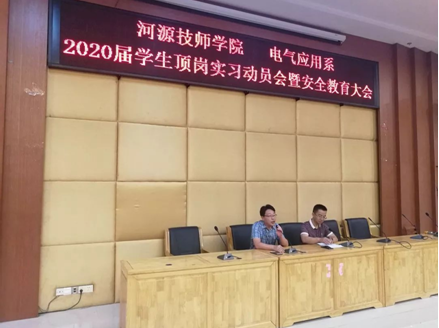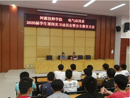为了提高我系学生顶岗实习工作质量,指导学生做好顶岗实习的各项准备,6月12日晚,电气应用系在培训楼讲学厅举行了2020届学生顶岗实习动员会暨安全教育大会。会议由系主任张雪峰老师主持,系部学管副主任谷瑞光老师、各班主任及实习班级全体同学参加。