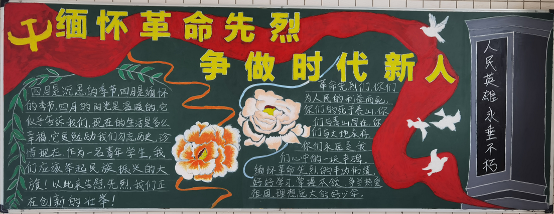 2021-04-25为缅怀革命先烈,弘扬爱国主义精神,加强爱国主义教育,营造浓厚的校园红色文化,近期经济贸易系开展了“缅怀革命先烈·争做时代新人”主题黑板报评比活动。 此次黑板报,内容紧扣主题,体现革命先烈的感人事迹,缅怀革命先烈的丰功伟绩,版面设计美观、结构合理、书...