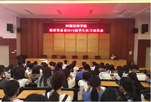 2018-06-17经济贸易系召开2019届学生实习动员会 2018年6月11日下午,经济贸易系在培训楼讲学厅召开2019届学生顶岗实习动员会。经济贸易系副主任曾晓莉在会上作动员讲话。 (图一)讲座开始(图二)讲座现场 曾晓莉老师强调,“定位”最重要。跟岗、顶岗实习的主要目的,是...