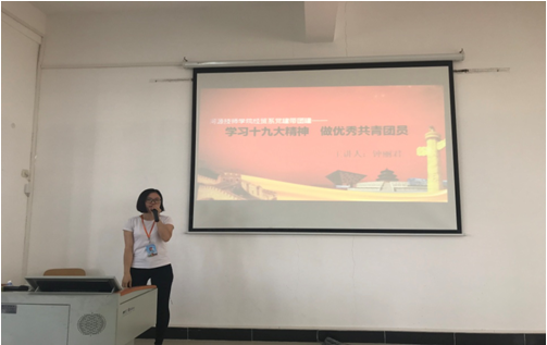 2018-06-07学习十九大精神·做优秀共青团员——经济贸易系开展“党带团”活动 2018年5月21日下午,经济贸易系在培训楼阶梯教室召开了“学习十九大精神•做优秀共青团员”讲座。讲座由经济贸易系钟丽君老师担任主讲,经济贸易系全体党员、团总支书记徐斯斯、各班团支部书记以及全...