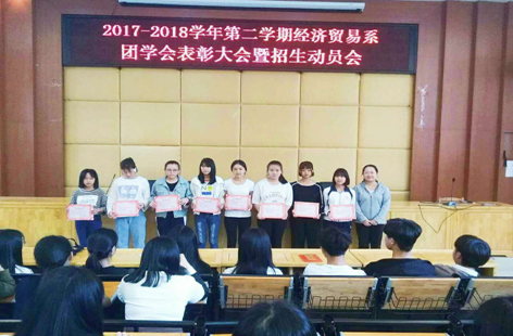 2018-04-02经济贸易系召开2017-2018学年第二学期团学会表彰大会暨招生动员会 2018年3月28日中午,经济贸易系在培训楼讲学厅召开团学会表彰大会暨招生动员会。经济贸易系团总支书徐斯斯老师出席了会议,并作团学会工作总结和招生动员。(图一)受表彰同学合影(图二)徐斯斯老师讲话徐斯斯...