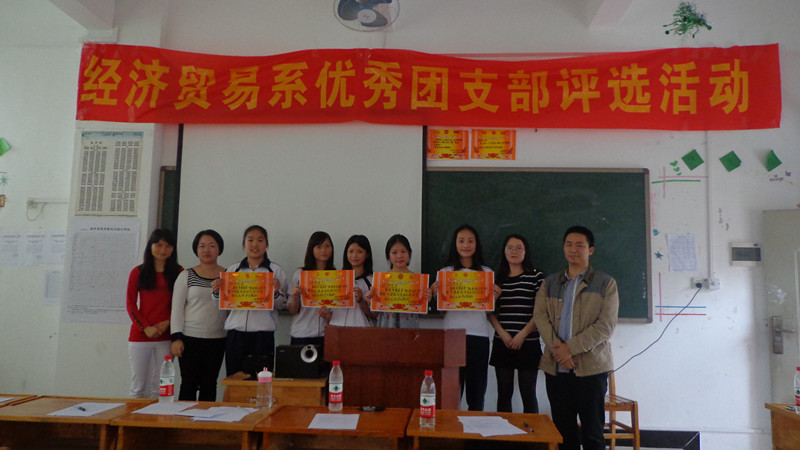 2015-04-30经济贸易系举行“优秀团支部”评选活动 2015年3月30日下午,经济贸易系“优秀团支部”评选活动在培训楼C306课室举行。系副主任曾晓莉、系团总支书记徐斯斯、温丹霞老师和彭斯亮老师担任活动评委。各团支部学生代表通过PPT和演说的形式,展示了本支部的团员风采、支部活动...
