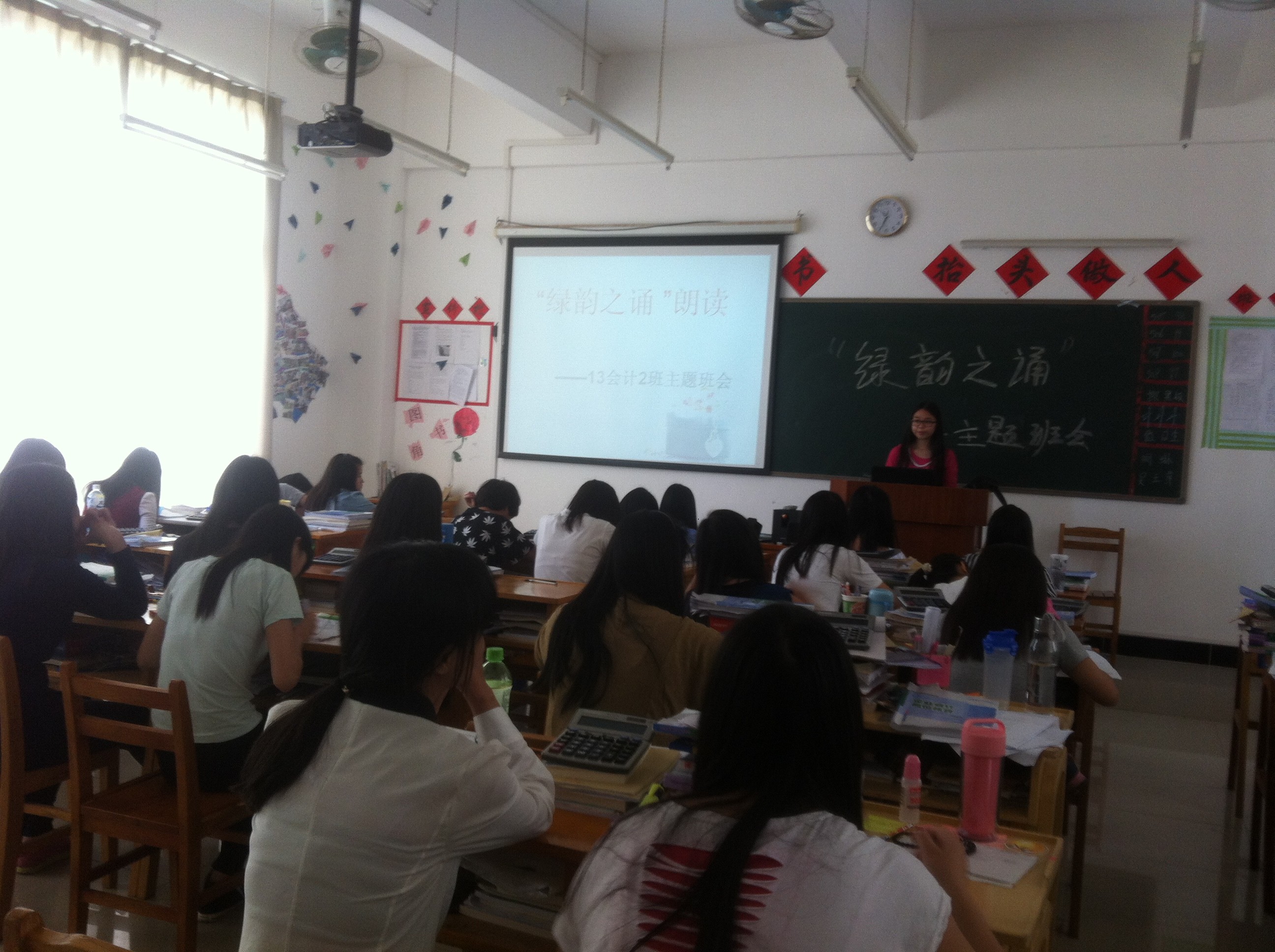 2014年4月14日下午财会教学部各班在本班举行“绿韵之诵”朗读活动。希望通过朗读经典诗文能激发同学们对朗诵的兴趣,使同学们通过朗读经典的心灵类文章,熏陶文学修养,促使自身心理成长。