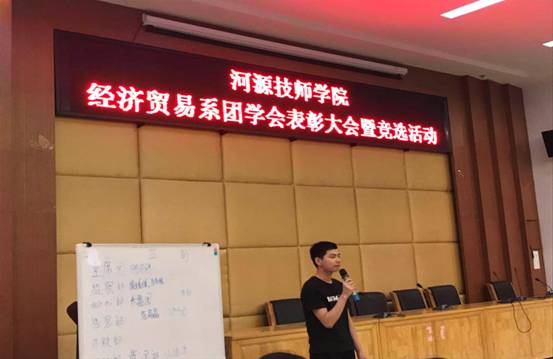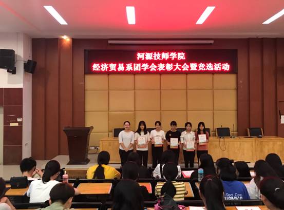 2019年6月6日,经济贸易系团学会在培训楼讲学厅召开了团学会干部表彰大会暨竞选活动。经济贸易系团总支书记徐斯斯老师出席,团学会副主席黄翠珊同学主持了会议。