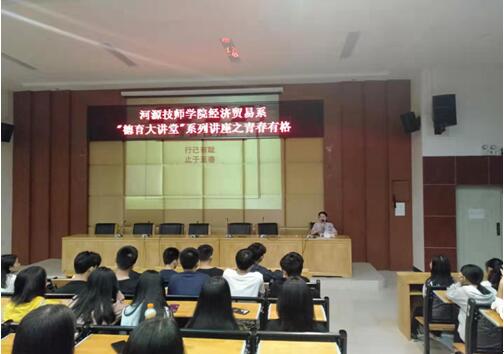 为深入推进“不忘初心、牢记使命”主题教育,贯彻落实学院关于“守好德育文化墙,讲好德育故事”的立德树人根本任务,引导学生弘扬和践行社会主义核心价值观,经济贸易系开设“德育大讲堂”系列讲座活动。2019年10月24日晚,经济贸易系“德育大讲堂”系列讲座开班仪式在培训楼讲学厅举行,该系党支部书记、主任刘晓霞主持,专业教师吴亚惠为该系全体学生带来一场精彩纷呈的“青春有格——行己有耻,止于至善”主题讲座。