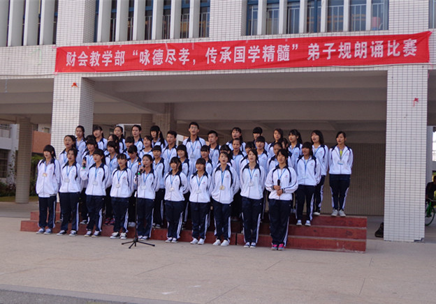 “弟子规,圣人训,首孝悌,次谨信。”2013年11月25日下午,财会教学部在实训楼广场学举行“诵经典,传美德”《弟子规》背诵比赛,旨在培养学生养成读书的习惯,营造文明的校园氛围,创设和谐的校园环境。