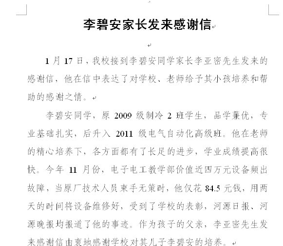 李碧安家长发来感谢信 1月17日,我校接到李碧安同学家长李亚密先生发来的感谢信,他在信中表达了对学校、老师给予其...