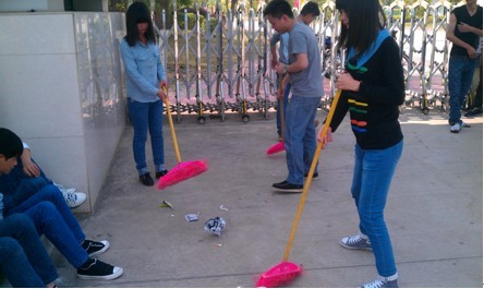 活动开始前,同学们都已经等在学校门口等待班干部分配任务了,有的同学在工具还没到齐之前就迫不及待地先劳动起来。活动中,同学们都迸发出十足的热情,细心地清理校门口和公共汽车站的每个角落。虽然烈日炎炎,但同学们没有嫌脏嫌累,他们拿着“武器”抢着到垃圾最多的地方清扫。在大家的共同努力下,公交站被打扫得一尘不染,让路过的人和等车的乘客眼前一亮。