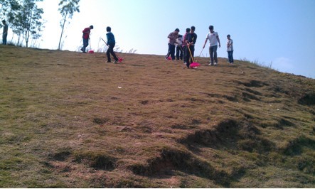 (图二)同学们发现校门口山坡上面也有不少垃圾,体育委员刘新平带领了7名同学爬上山坡从上至下清扫起来
