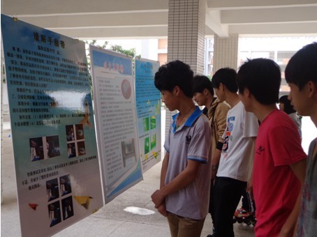 3月25日,河源市青少年科技创新大赛历年来参赛获奖作品在我校展出,吸引了很多同学驻足观看。
