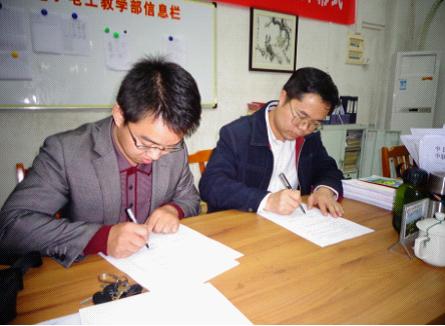 (图二)“师傅”(右)、“徒弟”(左)签写协议书