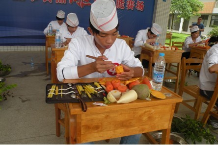 蛋糕裱花赛场的不远处,“食品雕刻”比赛已经过去3个多小时,进入了“白热化”阶段。虽然材料大致相同,选手们使用的工具也是相差无几,但材料仍然在不同同学的手里千变万化着,材料切割的薄厚和角度使得花朵们具有不同的形状,体现了雕刻者不同的技艺水平和创意。俗话说“台上一分钟,台下十年功”,任何高超的技艺都离不开刻苦的练习,熟能生巧是一个学习者必经的过程。整个雕刻现场,简直像一个微型的艺术展,每个人都将自己的作品视为一件艺术品,专注地打造。同学们手中的不再是普通的食材,而是一个充满灵魂的作品,一雕一琢都倾注着学子们的心血。最终,曾利健同学在15名参赛选手中脱颖而出,勇夺桂冠。