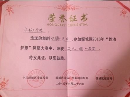 近日,我市在老城中山广场举行源城区2013年“舞动梦想”舞蹈大赛。为了响应“繁荣与发展河源文化事业”的号召,打造我校艺术品牌,丰富学生课余文化生活,我校舞蹈队积极参赛,并凭借其精湛的舞技一举夺冠。