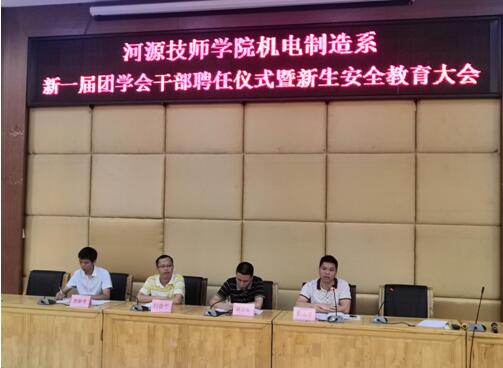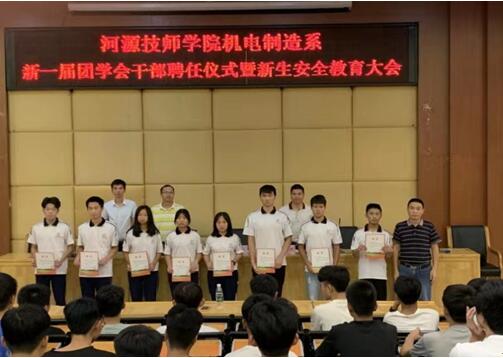 2019年10月16日下午,机电制造系在学院培训楼讲学厅举行新一届团学干部聘任仪式暨新生安全教育大会。机电制造系全体团学干部、2019级新生及班主任参加了此次大会。