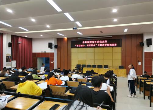 按学院党委关于扎实抓好基层党支部“不忘初心、牢记使命”主题教育的工作部署,为深入学习贯彻习近平新时代中国特色社会思想,2019年10月31日晚,旅游服务系党支部在培训楼讲学厅举行了“不忘初心、牢记使命”主题教育知识竞赛活动。