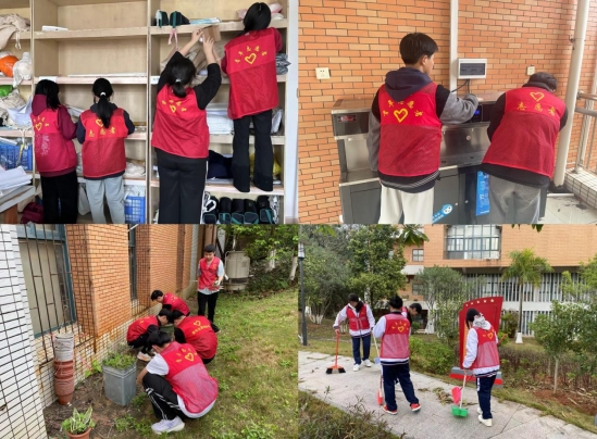 志愿者们身着红马甲,精神饱满地投入到卫生清洁工作中,对校园各个区域的卫生进行了全面的整治,尤其是针对教学楼卫生死角、草坪的杂草、校道的落叶等杂物发起了“总攻”。