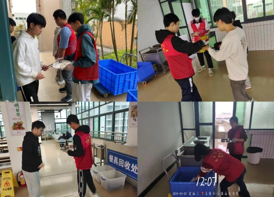此外,学生社团志愿者成了学校饭堂里一道亮丽的“风景线”,开展了“饭堂服务周”志愿活动。志愿者们有的负责分发饭菜、有的进行卫生打扫、有的负责餐具回收等。在各个环节中,志愿者们都展现出了高度的责任感和敬业精神,赢得了师生们的一致好评。