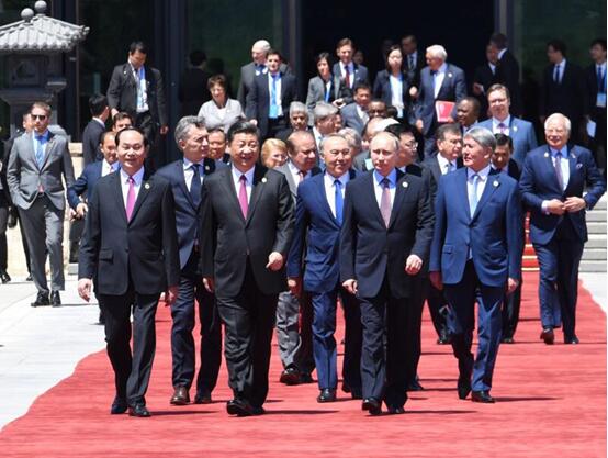 5月15日,“一带一路”国际合作高峰论坛圆桌峰会在北京雁栖湖国际会议中心举行,国家主席习近平主持会议并致开幕辞。这是第一阶段会议结束后,习近平同外方代表团团长及嘉宾步出雁栖湖国际会议中心。新华社记者 饶爱民 摄