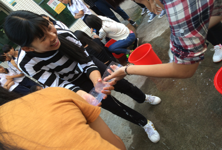 活动以“环保再利用、珍惜水资源”的理念,用矿泉水瓶作为原料做成一个个接水的“水槽”。参赛选手们每8人为一组,所有队员都只能利用手上两头漏水的“水槽”串联成“水管”后,将水从起点运送到终点的桶上,在规定时间内桶里的水最多者为胜。同学们热情高涨,纷纷讨论如何以最快的速度将水引流,并根据商量的对策齐心协力、有条不紊地完成游戏。