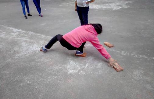 “搭桥过河”活动按宿舍为单位进行,每组4名同学参加。参赛同学主要用双手将砖块搭成桥,从起点到终点趟过河,用时最短的获胜。考验的是同学们的身手矫健度和灵活度。
