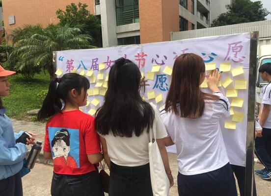 瞧!活动现场气氛十分活跃,在现场活动人员的指引下,女生们有序地用笔在便利贴上写下了自己的心愿。满满的愿望被张贴在女生正门处的两块许愿板。活动过程中,女生们还能收到女生节日小礼物,让每一位同学感受到浓浓的情意。
