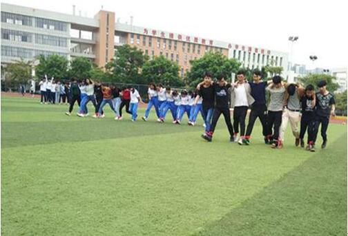 活动以“迈步同进·共赢未来”为主题,旨在提高学生团队意识,携手同进。参与活动的同学们以宿舍为单位,8人一组站成一排,组员相邻的腿用绳系牢,一起从起点到终点往返一次,用时最短为胜。比赛开始,同学们喊着口号“一、二,一、二……”往前奔去,简单的步伐考验的是组员间的信任与默契。刺激而欢乐的比赛气氛渲染了整个足球场,观众们也不断呐喊为参赛的同学加油。