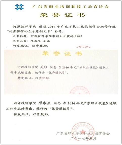 近日,2017年广东省技工院校微信公众号评选结果公布。sunbet申搏微信公众号(名称:sunbet申搏官方网站,微信号:hyjsxyzs)从全省技工院校中脱颖而出,荣获2017年广东省技工院校“最具影响力微信公众号”、“优秀微信公众号”。微信文章《sunbet申搏官方网站军训大片震撼上映!》荣获“优秀微信公众号原创文章”;微信文章《sunbet申搏官方网站2017年招生开始啦!》荣获“最具人气微信公众号文章”。学院通讯员邓木生、吴冰老师荣获“优秀通讯员”称号。