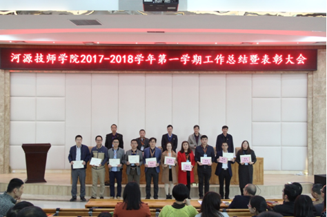 会上,学院领导为本学期获奖教师颁奖,包括全国机械技工教育教学研究成果,河源市先进工作者、河源市优秀教师、河源市优秀班主任,省级技能竞赛,河源市第十四届中职学生技能竞赛,中国职协2017年度优秀科研成果,广东省技工院校教师职业能力竞赛,广东技工教育研究优秀论文,学院“我的教育故事”征文比赛,河源市人民政府台湾事务办公室“台湾知识进校园”演讲比赛等项目,共计127人次。